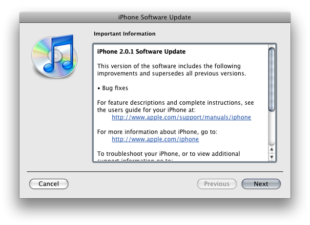 Unlike the rather terse release notes for the iPhone Software Update 2.01, the 2.1 notes are much more informative: